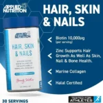 Applied Nutrition Hair Skin & Nails Capsules é um suplemento desenvolvido para apoiar a saúde do cabelo, pele e unhas através de uma combinação de vitaminas, minerais e ingredientes funcionais.