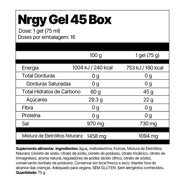 Nrgy Gel 45 contém a Nduranz Electrolyte Mix, uma mistura avançada de eletrólitos que repõe os minerais que perdes através do suor.